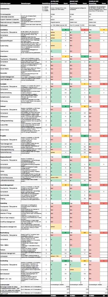 Diese kann hier als Excel heruntergeladen werden und soll bei der Evaluation einer CRM bzw. ERP-Lösung helfen den richtigen Entscheid zu fällen.